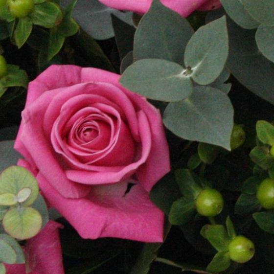 A dozen long stemmed pretty pink roses combined with mixed foliage and hypericum berries.