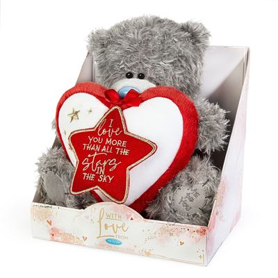 Add a dash of cuteness and sparkle to your Valentine's Day with this adorable Me to You bear. Tatty Teddy is holding a love heart with a star-shaped tag attached. The romantic message on the heart reads 'I love you more than all the stars in the sky'. This premium Tatty Teddy measures 19cm high.
