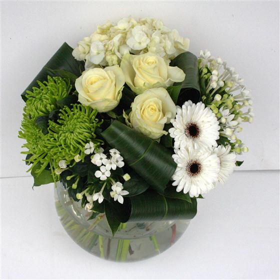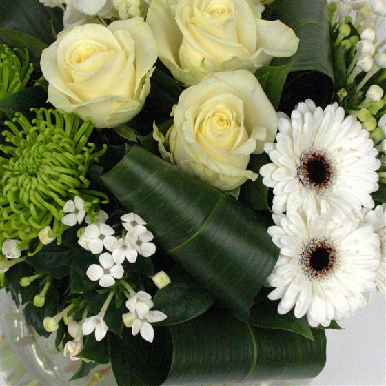 A modern array of white and lime blooms arranged as a sectional hand-tied bouquet, including roses, hydrangea and gerberas.