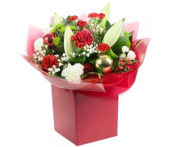 Bring cheer and joy to your nearest and dearest with this beautiful Christmas ensemble. You’re not just sending a floral gift but the full local florist experience. Amazing flowers and a surprise delivery guaranteed to put a smile on someone’s face. The arrangement will feature a florist choice selection or Red Spray Carnation, White Oriental Lily, White Spray Carnation, Gypsophila, Red Carnation, Green Santini, Hypericum and more.