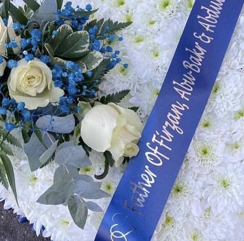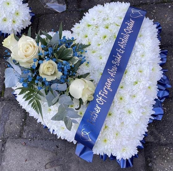 Beautifully presented 18inch heart show cased with Blue Roses - with any personalised ribbon to go across . Picture is showing an 18inch Image.