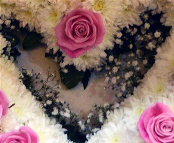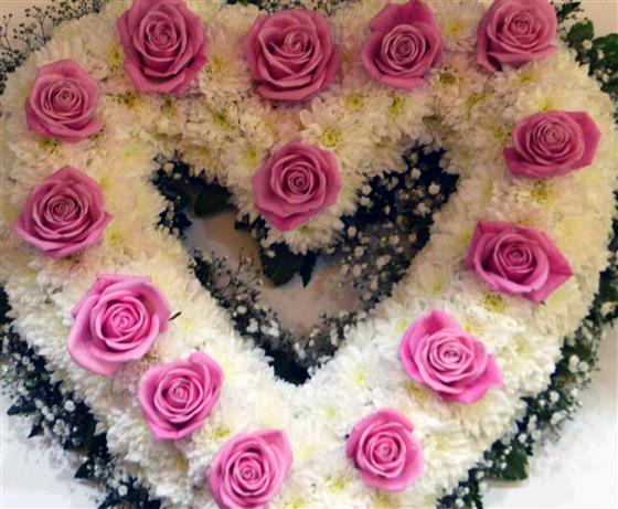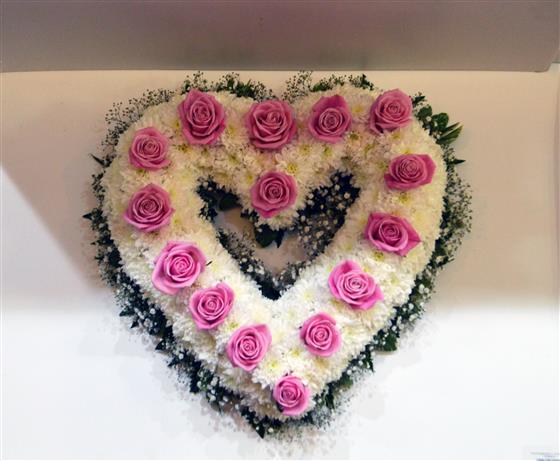 Classic white Chrysanthemum based open heart shape wreath with Roses.