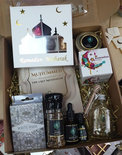 includes, Complementary Book ( Not retailed) Zam Sam water, Black Seed Oil, Honey, Spices, Ramdan Mubarak Cube, Ramadan Choc Box