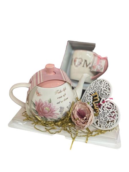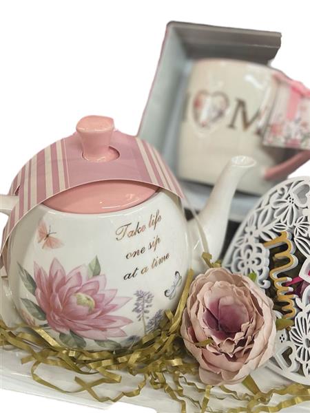This thoughtfully curated Mother's Day hamper is designed to bring joy and relaxation to any cherished mother. It features a charming teapot and matching mug, perfect for a peaceful afternoon tea break. A delicate flower, chosen for its beauty and symbolism, adds a touch of natural elegance. A heart-shaped keepsake ornament provides a lasting reminder of your love and appreciation. The entire hamper is presented in clear cellophane, tied with a beautiful hand-made bow, creating a visually appealing and heartwarming gift. Please note that due to seasonal availability, the contents of the hamper may vary slightly, ensuring each gift remains unique and special. This beautifully arranged hamper is certain to delight and create a memorable Mother's Day experience.