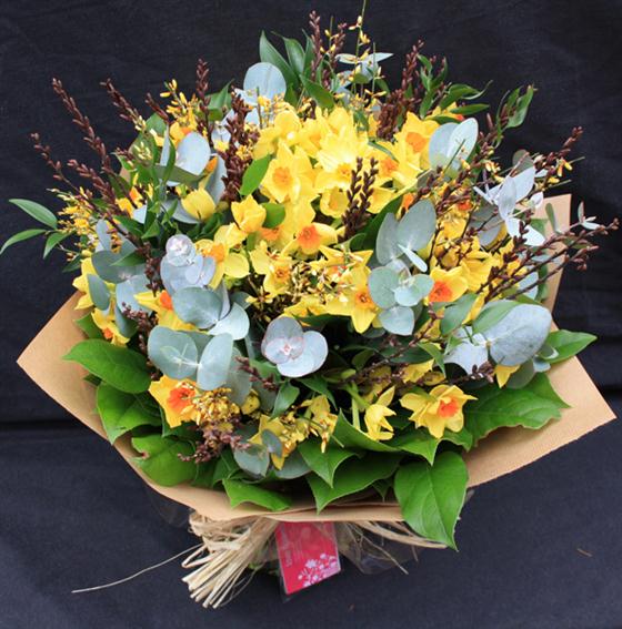 A spring bright bouquet of scented narcissi and seasonal foliage.